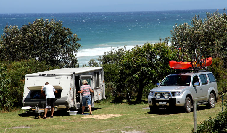 Between Bermagui and Tathra is a stretch of natural bush and coastline protected by the Mimosa Rocks National Park. The national park has three campsites suitable for camper van camping. All sites are beach front in shady untamed bush with toilets and campfire rings, but no showers. You can fall asleep to the sound of the ocean and enjoy fireside chats under a starry sky. All campsites are close to walking tracks and beaches.