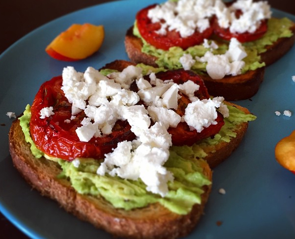 - Place the sliced roast tomato on top and sprinkle with Danish Feta.