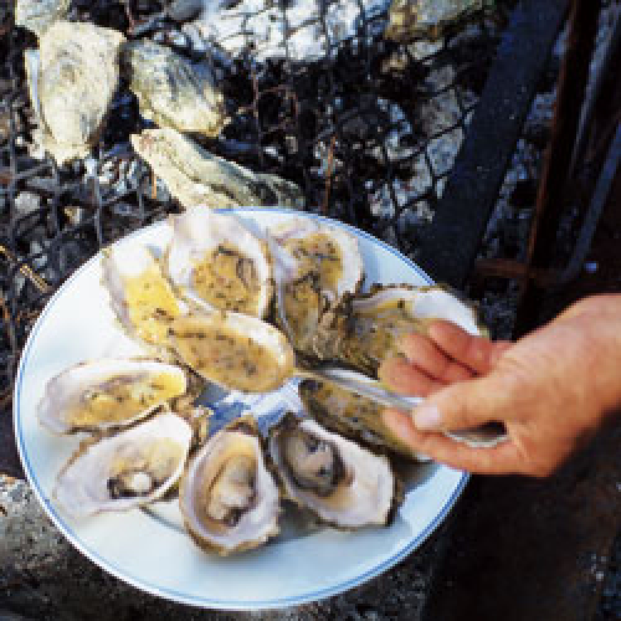 Sauté diced shallot in white wine then add everything else except the oysters. Grill the oysters in their unopened shells flat side up over hot coals until shells gape, 3-5 minutes. Discard any oysters that don’t open. Pry off top shells, keeping oyster juice from spilling, and cut lower muscles to release flesh. Arrange oysters in their shells on a platter. Spoon some sauce over each.