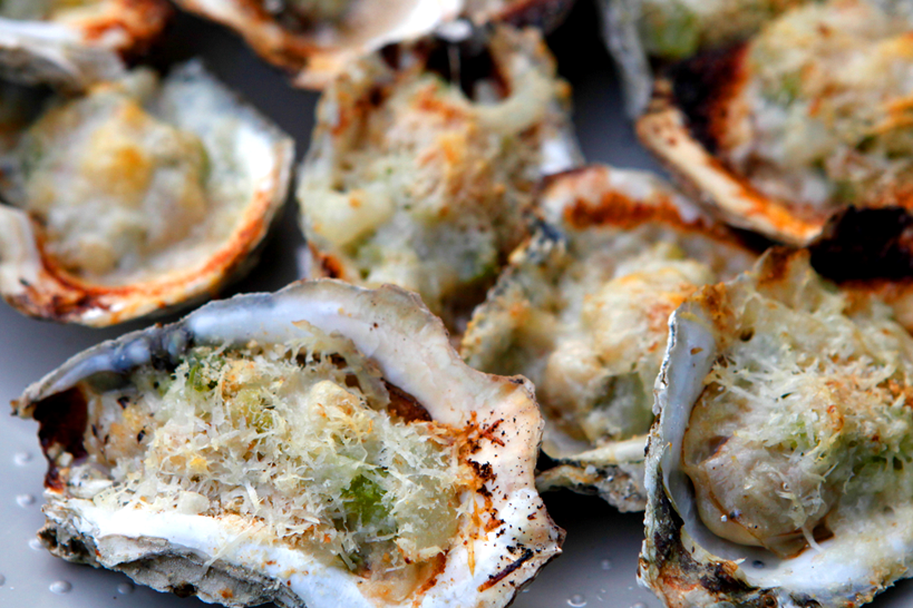 Combine garlic, butter, and parsley in a bowl. Put a knob of seasoned butter on each oyster and sprinkle bread crumbs on top. Broil until golden, 4–5 minutes. Sprinkle with a little cheese. Gruyer or parmesan work well.