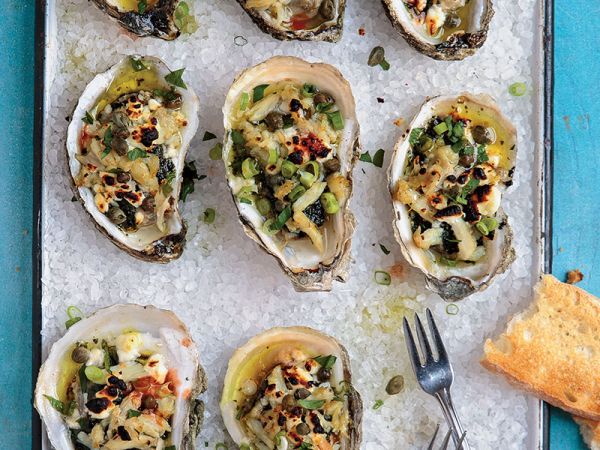 Saute garlic in a little oil until golden. Stir in herbs and pepper then spoon over oysters. Sprinkle with feta and capers. Grill for 2- 4 minutes. Serve with hot sauce, lemon wedges, and toasted ciabatta or crackers, if you like.