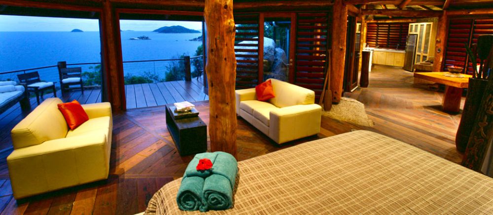 Bedarra Hideaway is a masterpiece by award winning architect Chris Van Dyke. Lovingly decorated by its former owner, renowned photographer Peter Lik, the interior is unique and elegant. The floors are of recycled railway sleepers and the ceilings of bleached logs. Stone African statues and onyx sinks give the bathroom a distinctive tribal flavour. The hand carved teak front door was imported from Bali and Bedarra Island’s original canoe hangs from the ceiling.