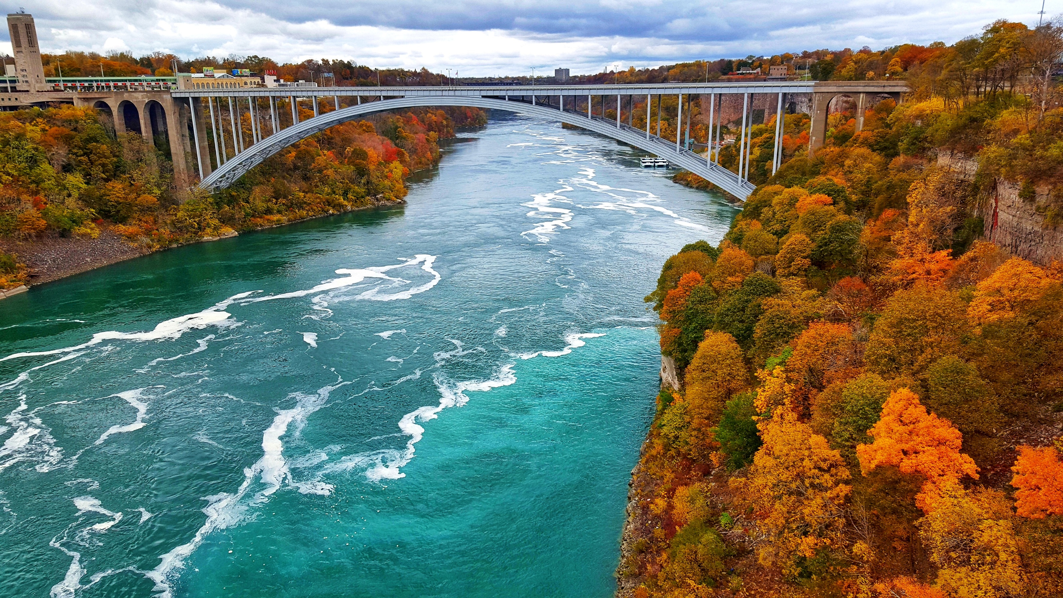 Whirlpool Rapids with Rainbow Bridge in the background and Niagara Falls beyond. (c) Jodie Brownlee