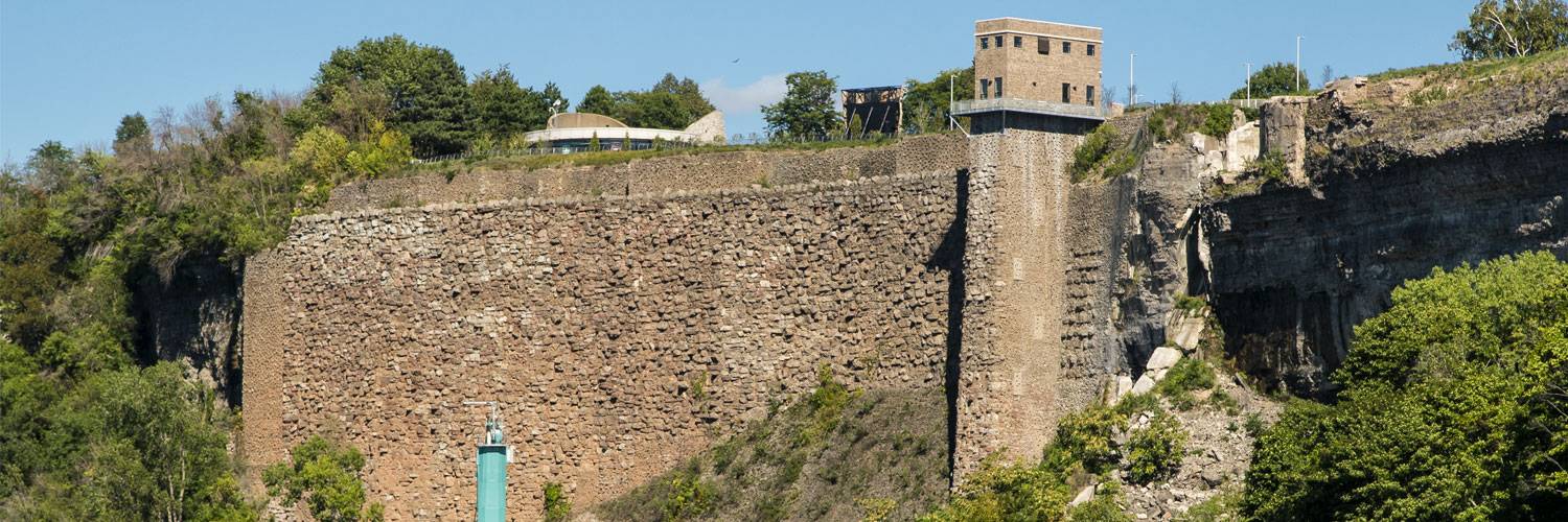The Niagara Gorge Hiking Trail starts at an elevator in the now defunct Schoellkopf Power Plant a ten minute walk from Niagara Falls passed Rainbow Bridge. The elevator shaft is brick with double doors into a lobby. Enter the double doors and take the elevator down the elevator shaft. You’ll exit onto a dockyard. Turn right and you’ll see the beginning of the trail head. If you have trouble finding it, search for Schoellkopf Power Plant on your GPS or visit the nearby Niagara Discovery Center to have it pointed out. When you reach the Whirlpool Rapids bridge, look for stairs. They’ll take you up to Whirlpool State Park.