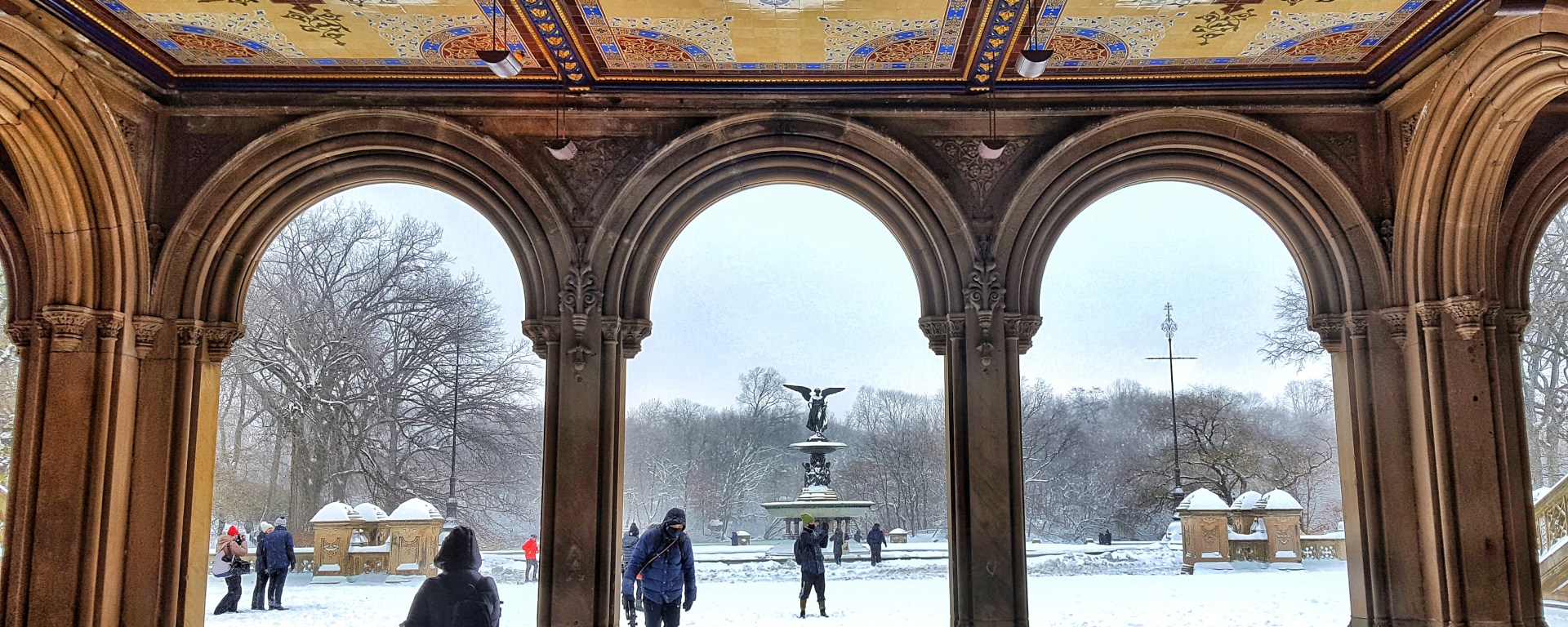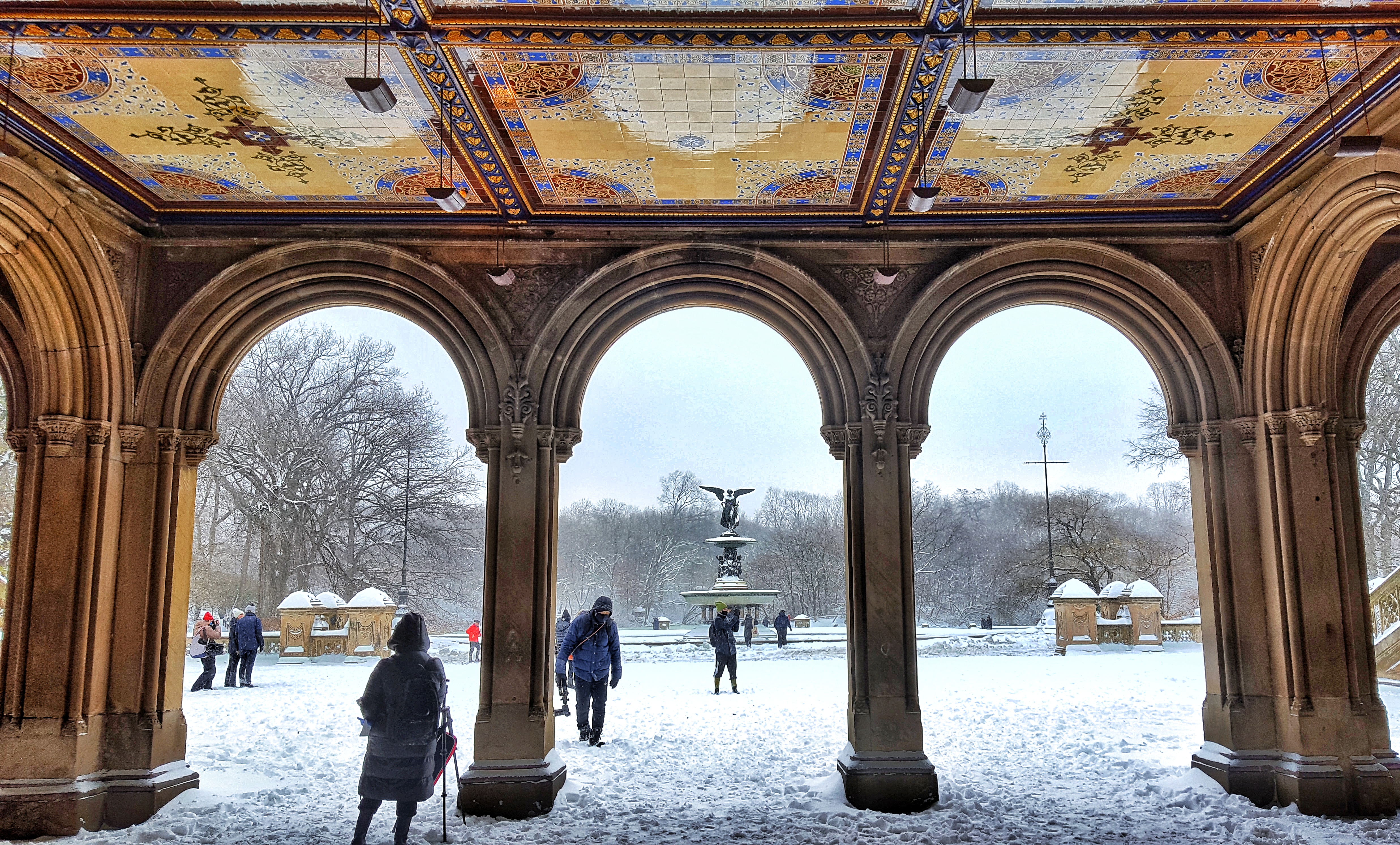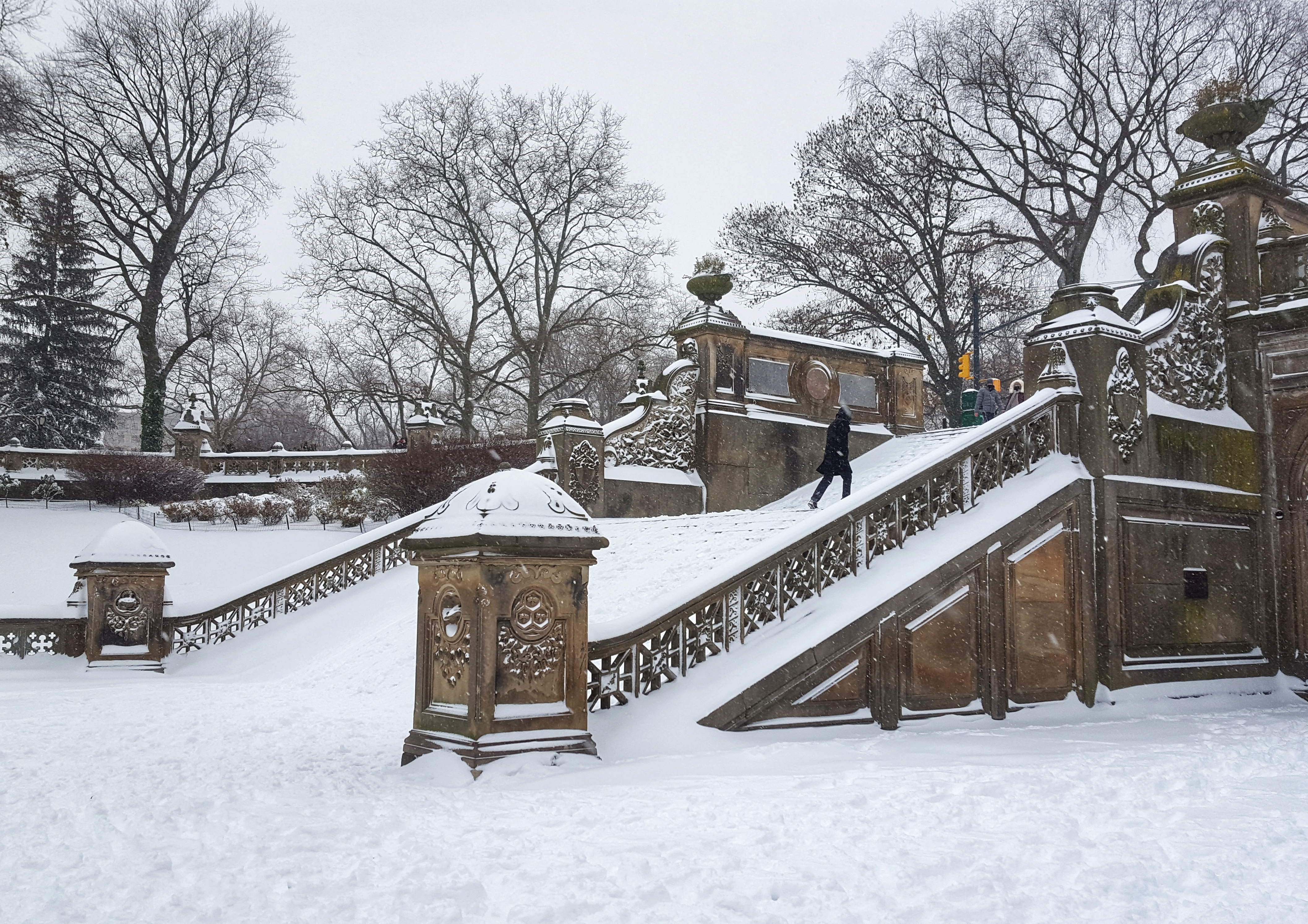 Bethesda Terrace, Central Park, New York with snow on the steps.